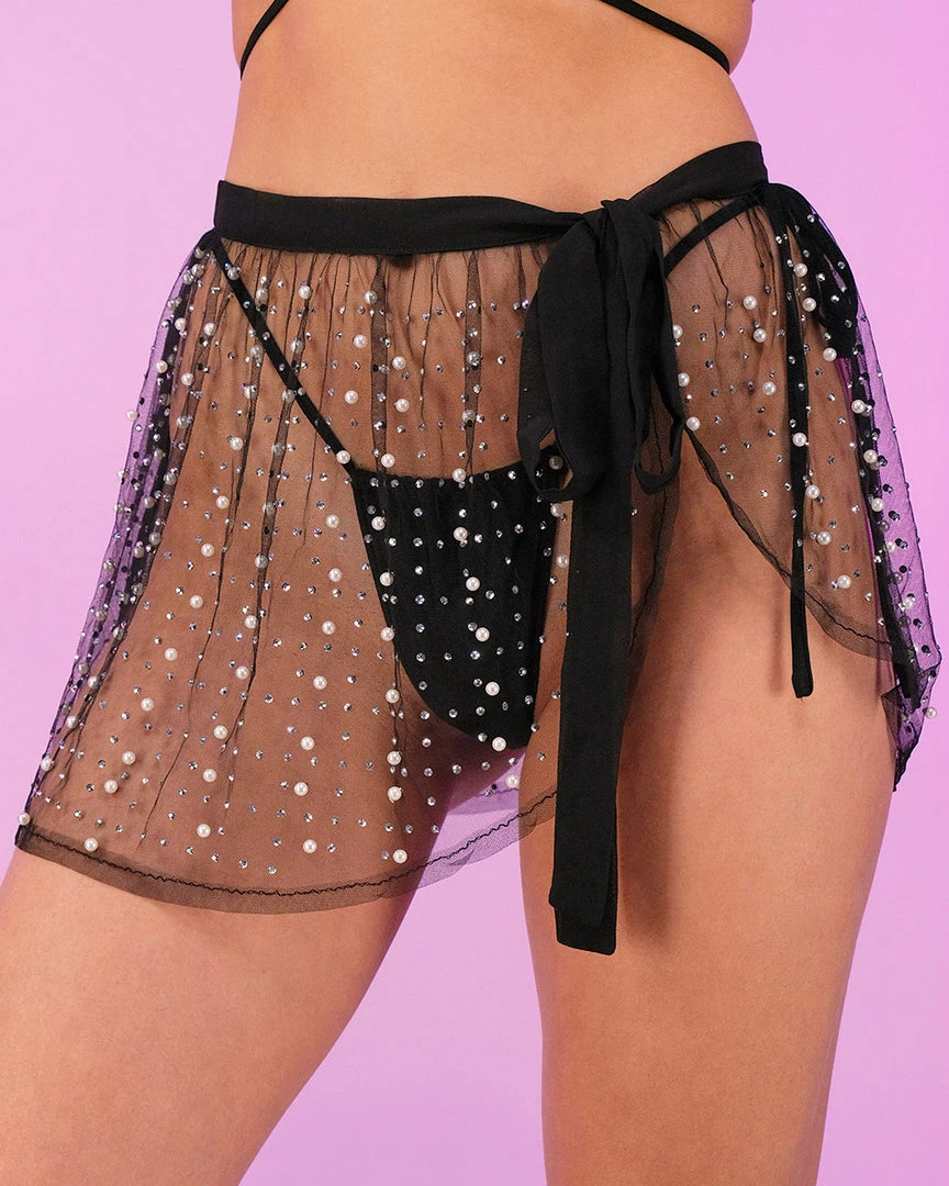 - Unlined Sheer Rhinestone and Pearl Beaded Tie Skirt