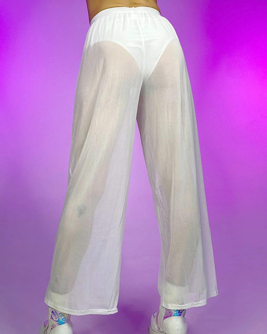 95% Polyester 5% Spandex Sheer Pants with elastic top band for secure and comfortable fit. Available in black and white.