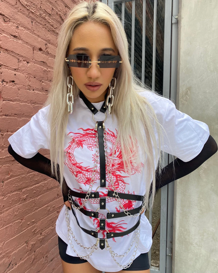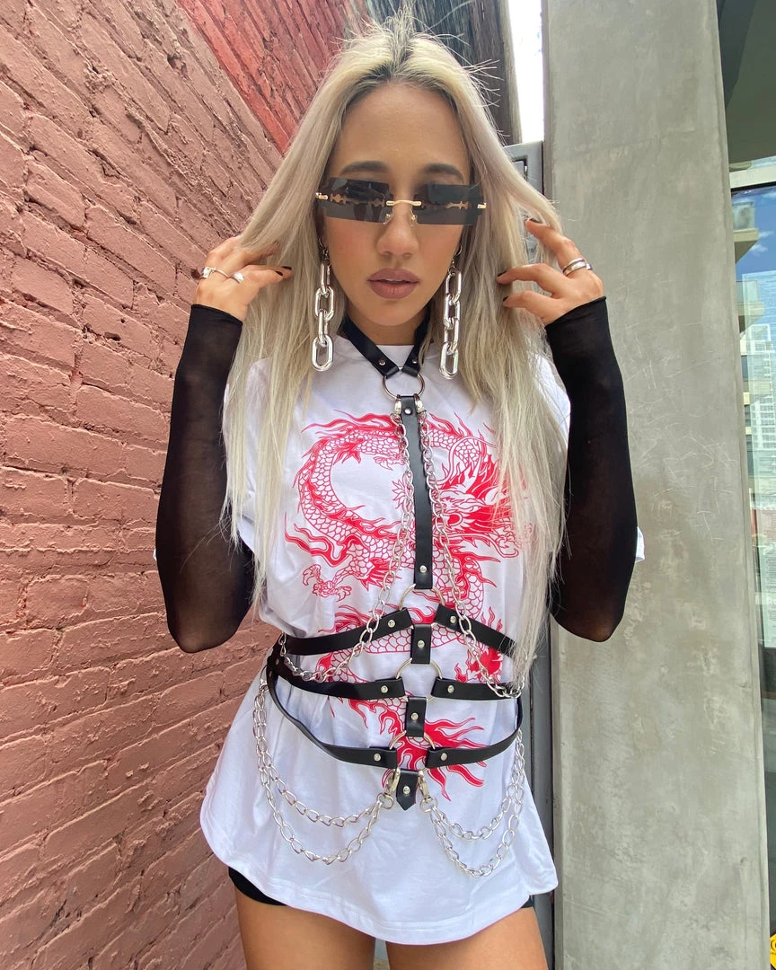 We are. WITH. THIS. VIBE. This harness top adds a lil extra sumthin sumthin to your outfit! One size fits most. Does not include pasties or undergarments.