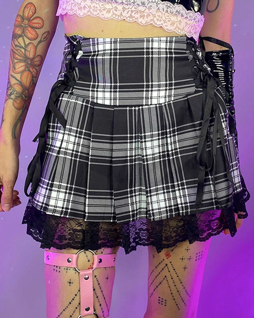 Ribbon and Lace Gray Plaid Harajuku Mini Skirt