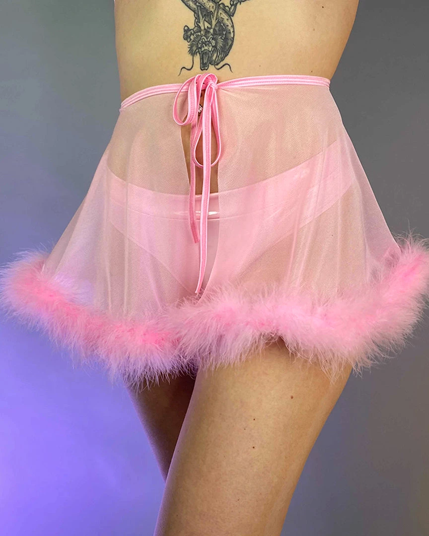 Sheer Plush Trim Tie Around Half Skirt. Faux fur.