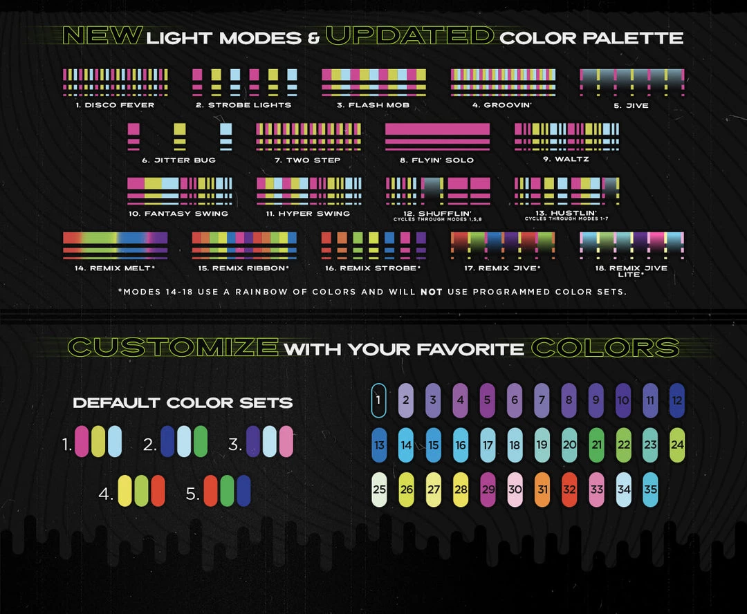 Never again will you feel limited when it comes to color combinations. The Space Whip Remix features a programmable microchip giving you 35 color choices with 18 custom light modes, 5 of which use a rainbow of colors! Choose any 3 colors to whip with, and when you have decided your favorites, save them! The Space Whip Remix comes with 5 programmable color sets. Say goodbye to the days of programming your whip every time you turn it on! Just power on and go. Or quickly reset to the factory default settings in less than 10 seconds any time.