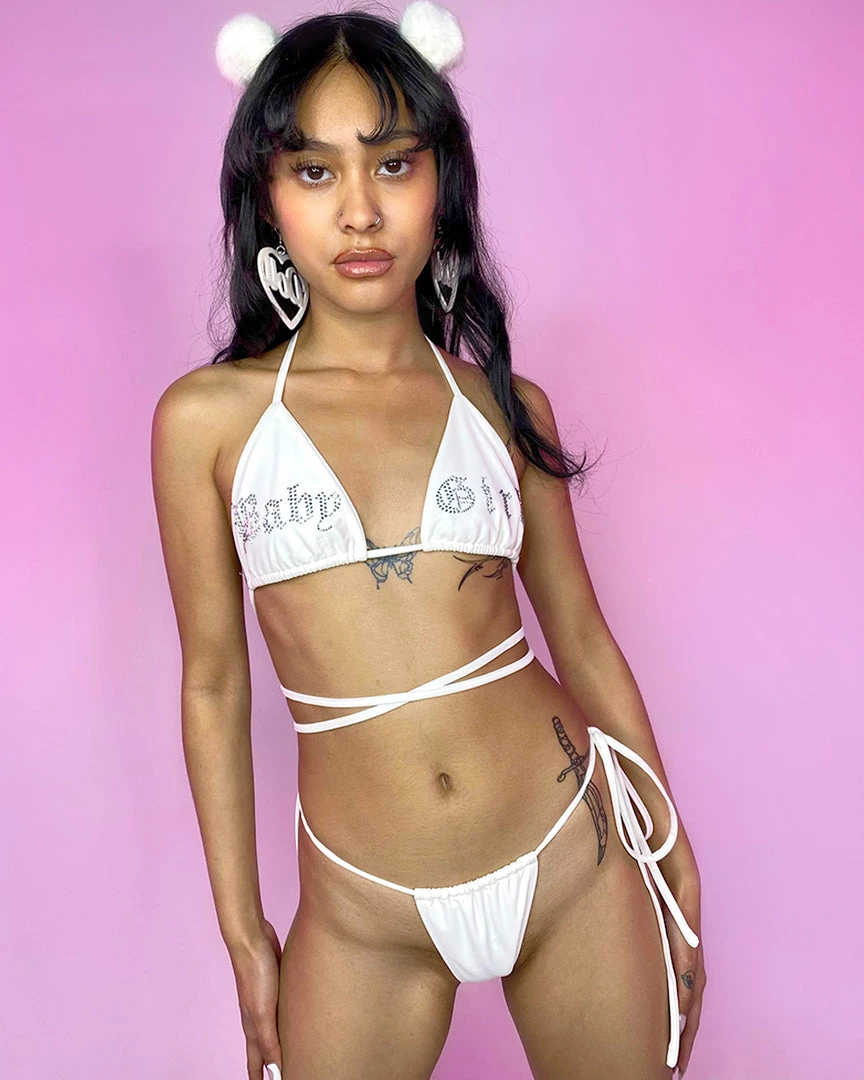 Featuring Triangle Bra Top, Self-Tie Bikini Bottom. Stretchy.