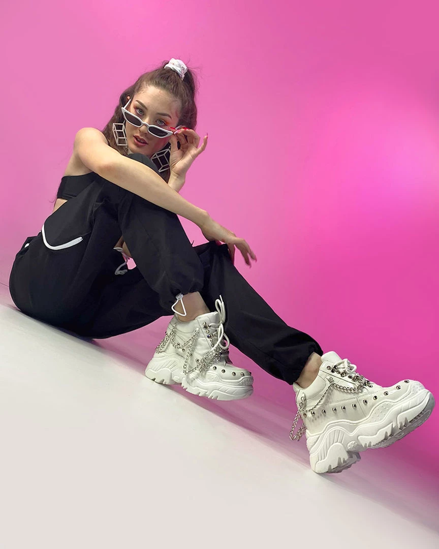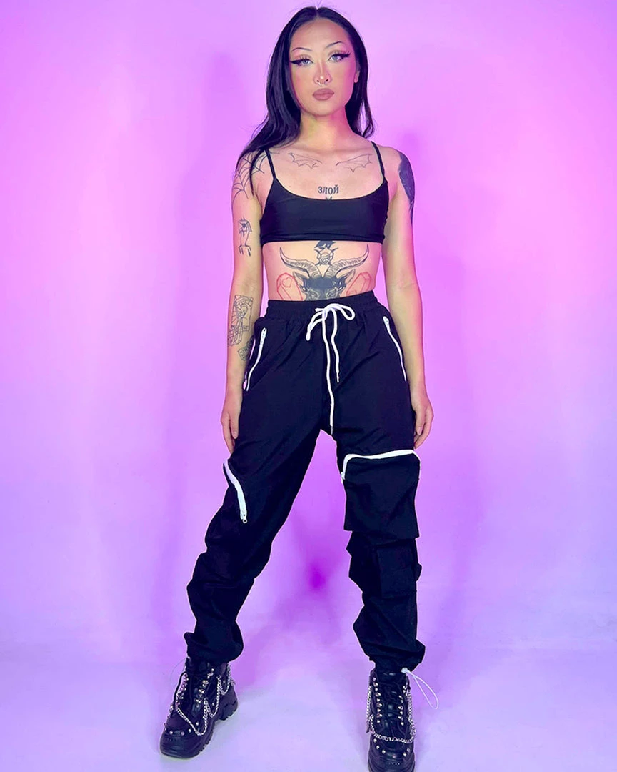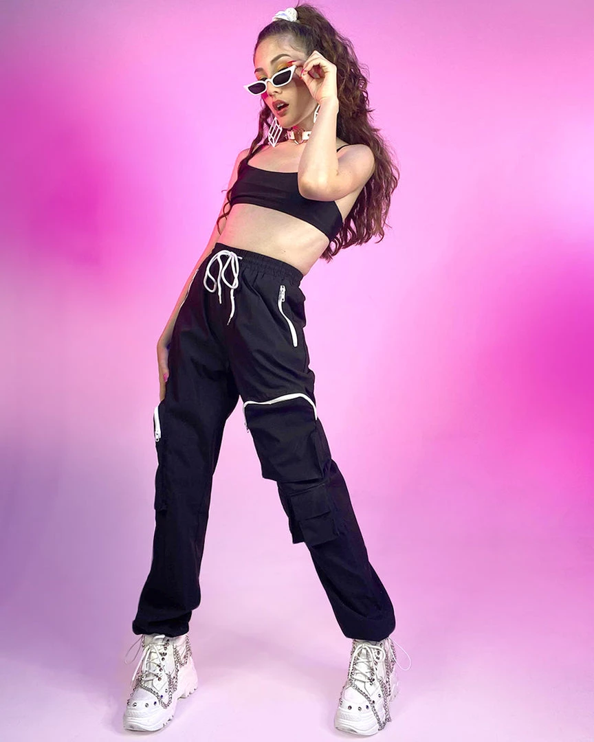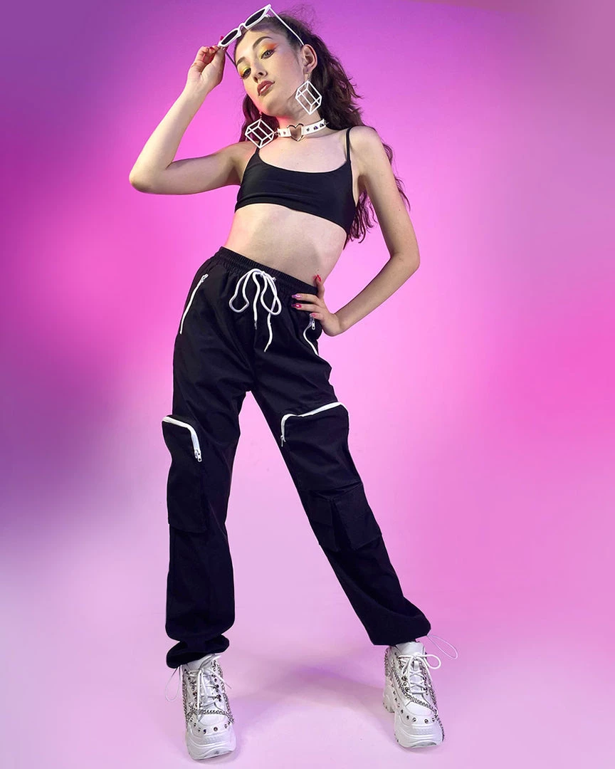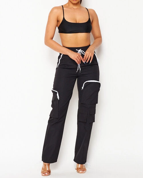 - Two Piece Set, Featuring Cropped Top with Adjustable Spaghetti Straps, Contrast Drawstring Pants with Utility Zipper Pockets.
