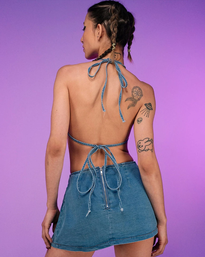 - Set includes medium wash denim top & skirt with rhinestone detailing