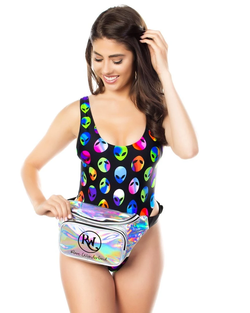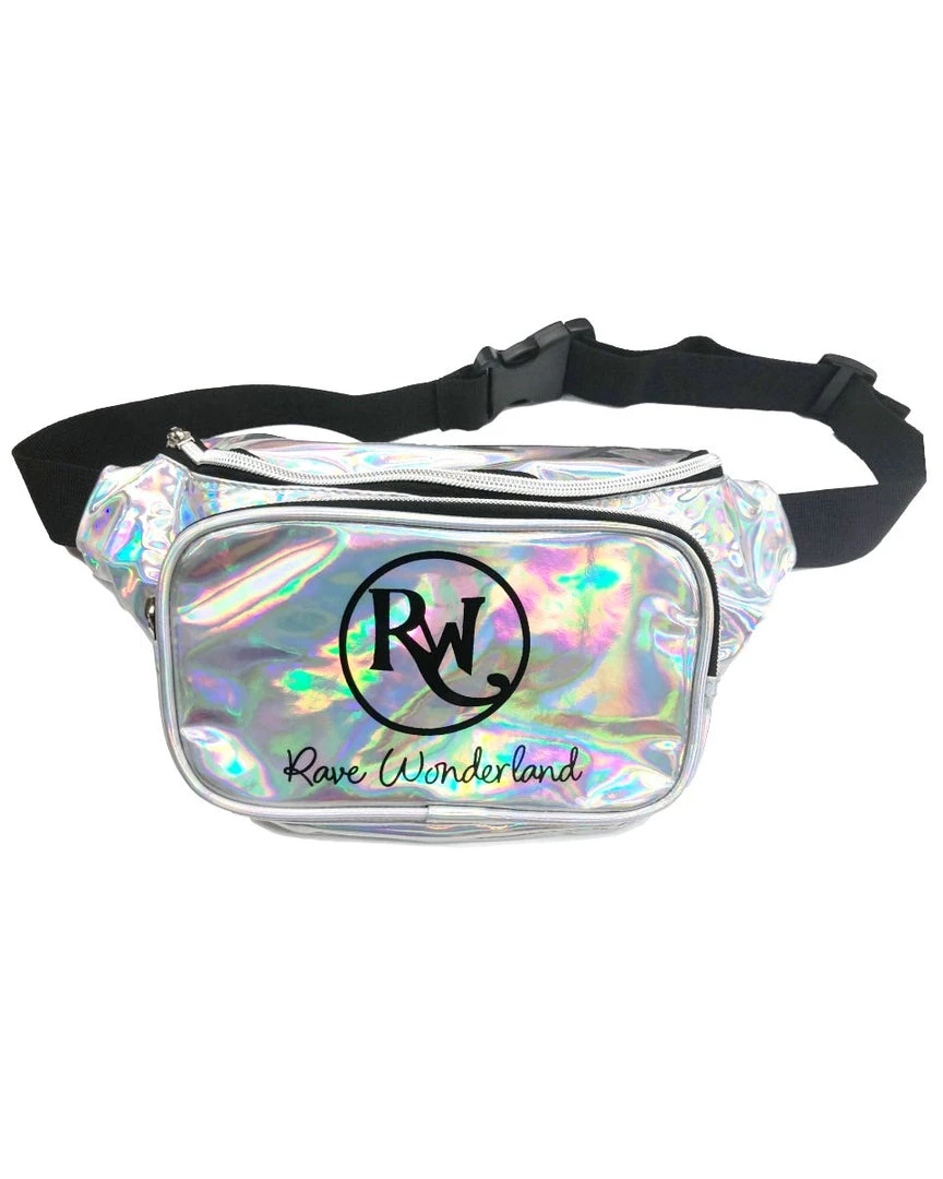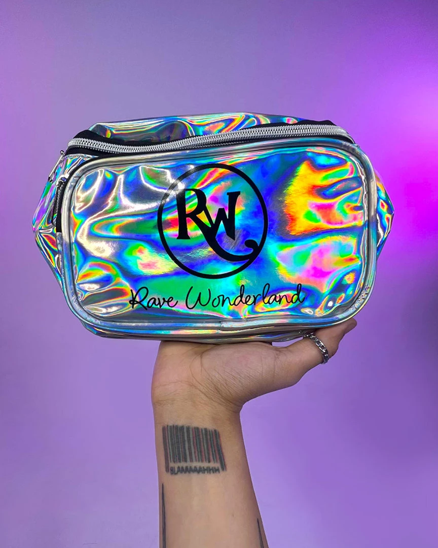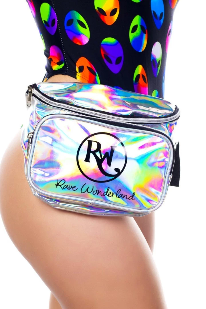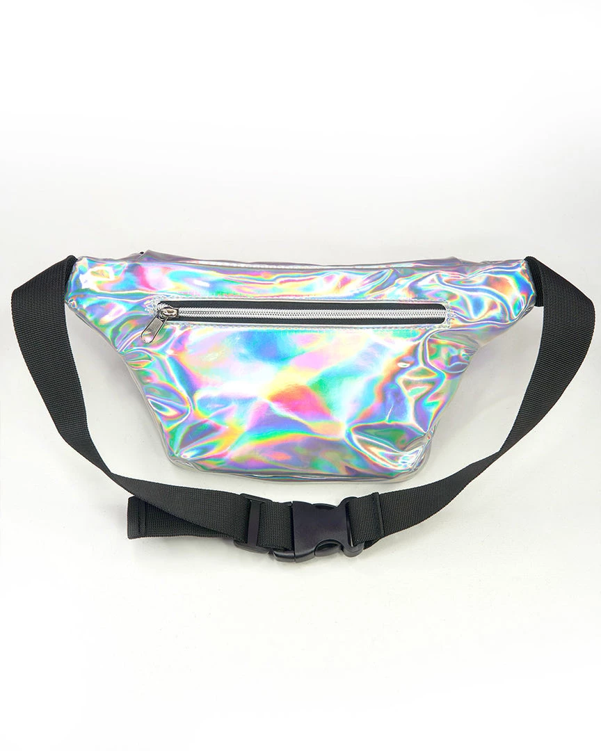 Holographic Silver Rave Fanny Pack. With three zippered pockets – top, front and back.
