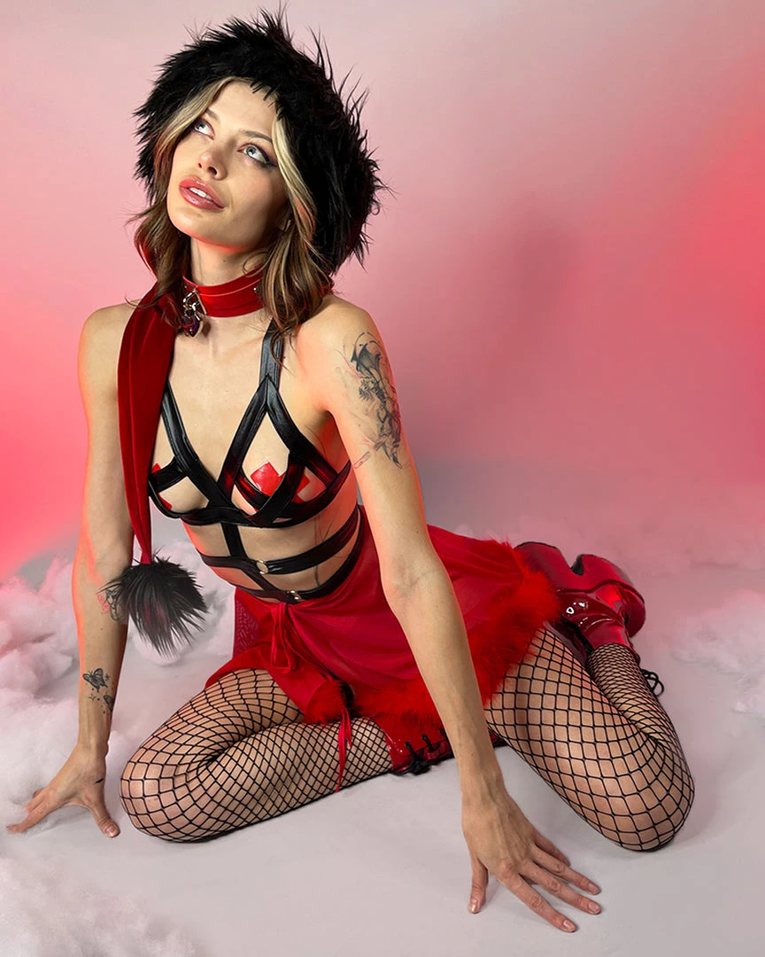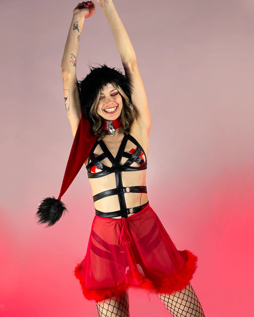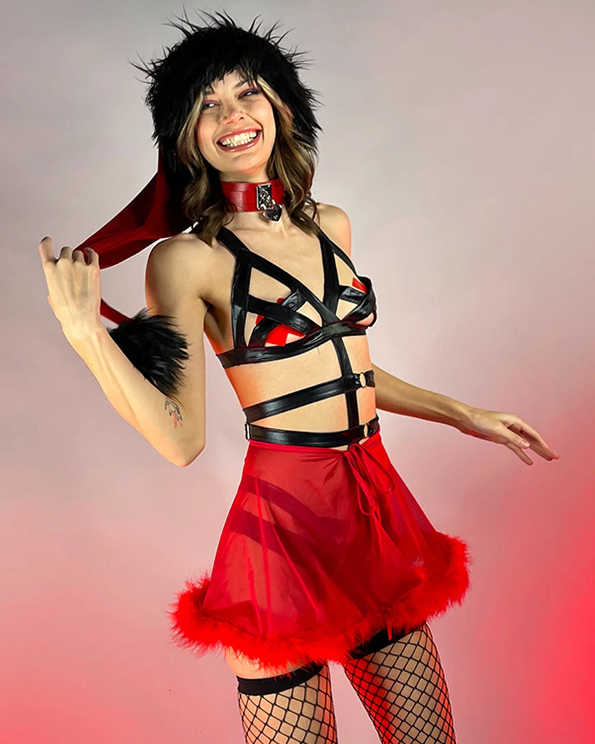 This 3pc set includes a g-string teddy with adjustable arm restraint straps and open cups, eye mask, and wrist restraints.