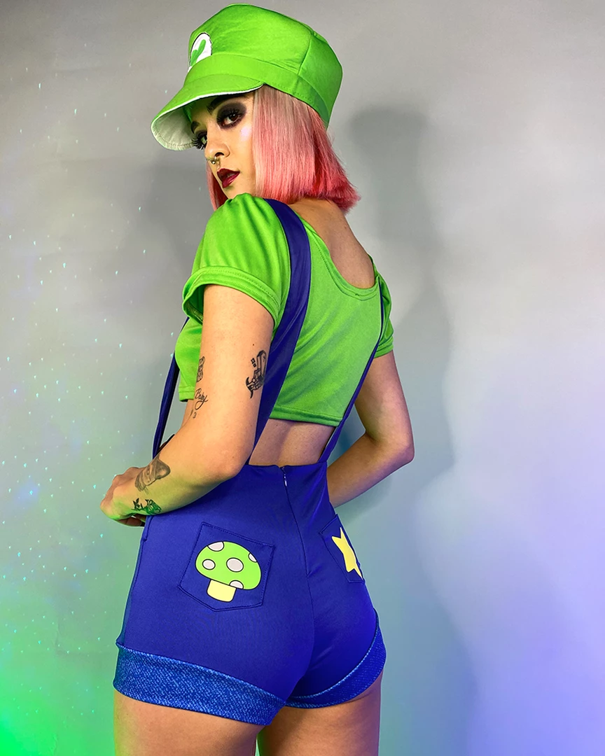 “IT’S A-ME, MARIOOOO!” This costume inspired by the timeless classic features a charter crop top, suspender shorts with iconic accents, and hat.