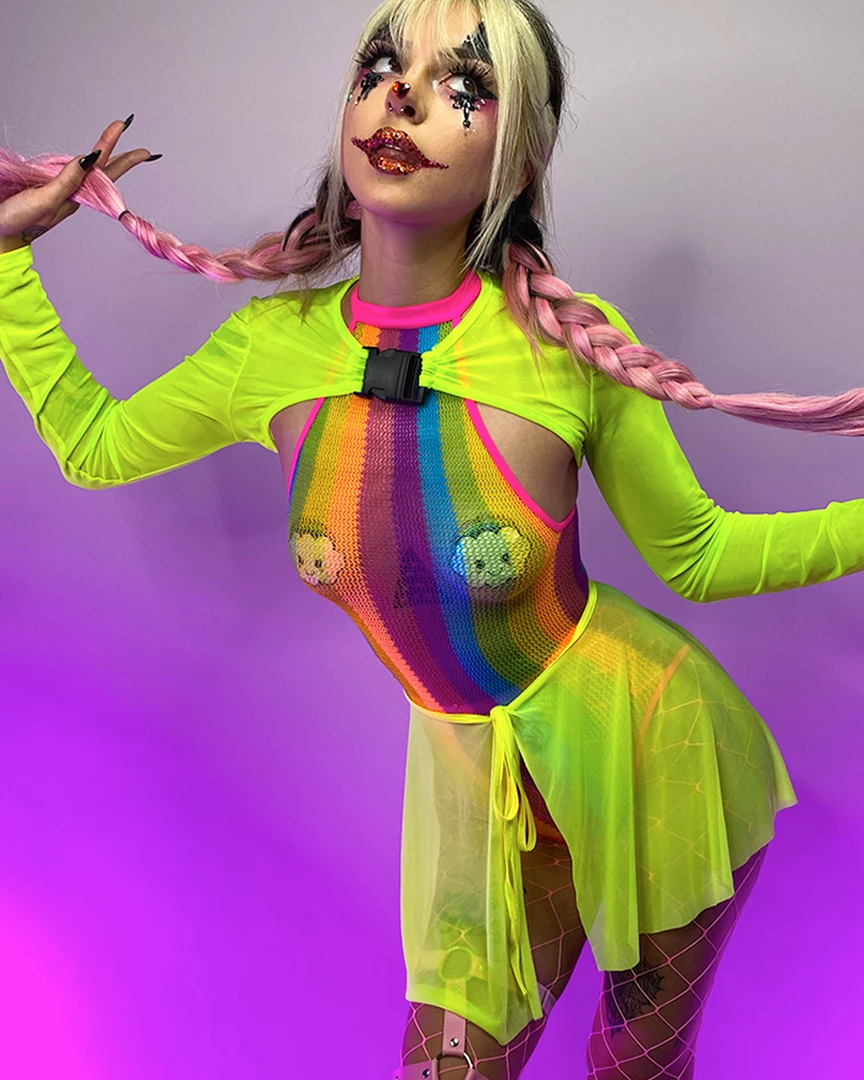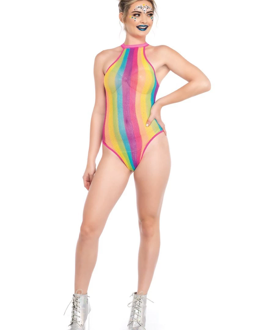Rainbow striped halter bodysuit with snap crotch.