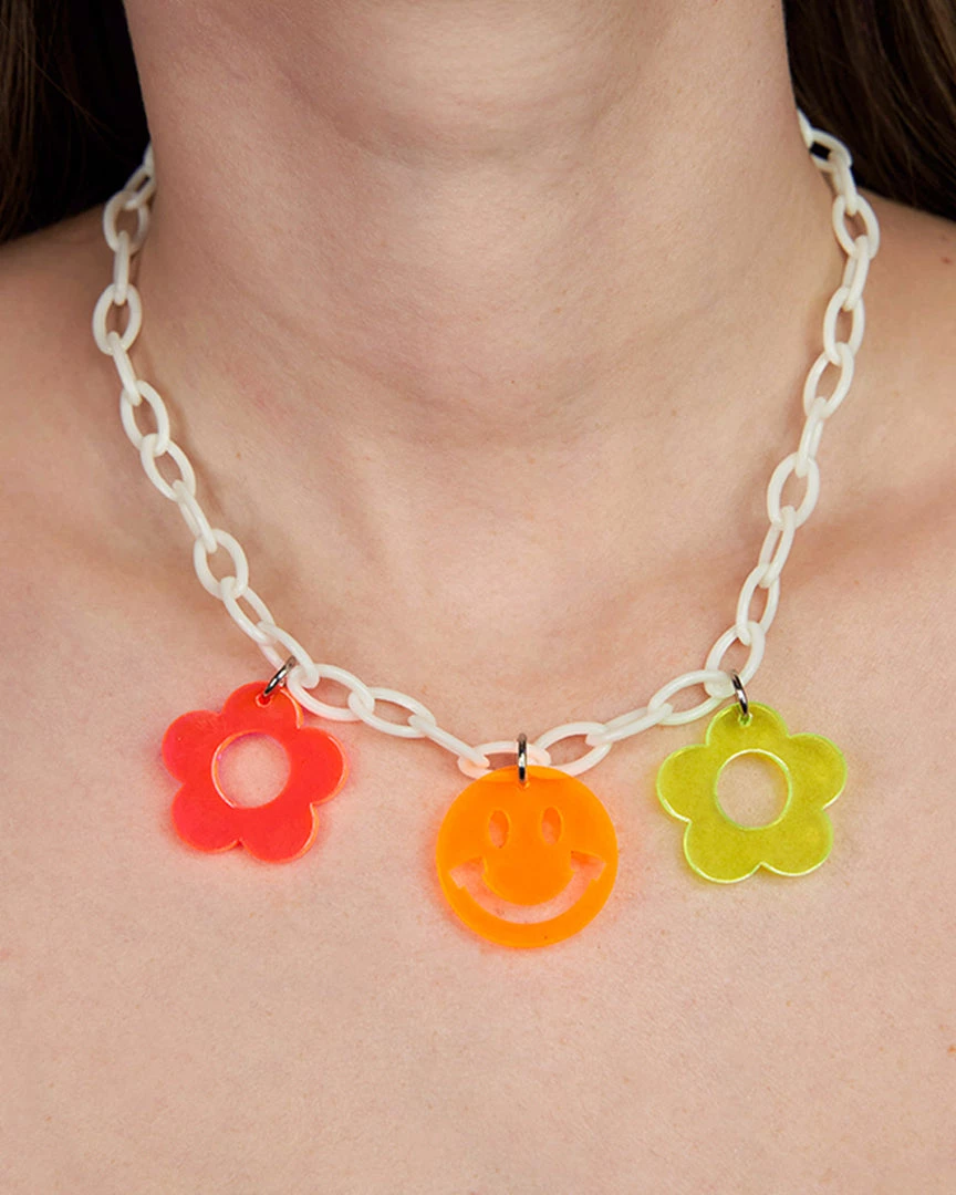 White chain with neon pink & neon yellow flower and orange smiley in the middle