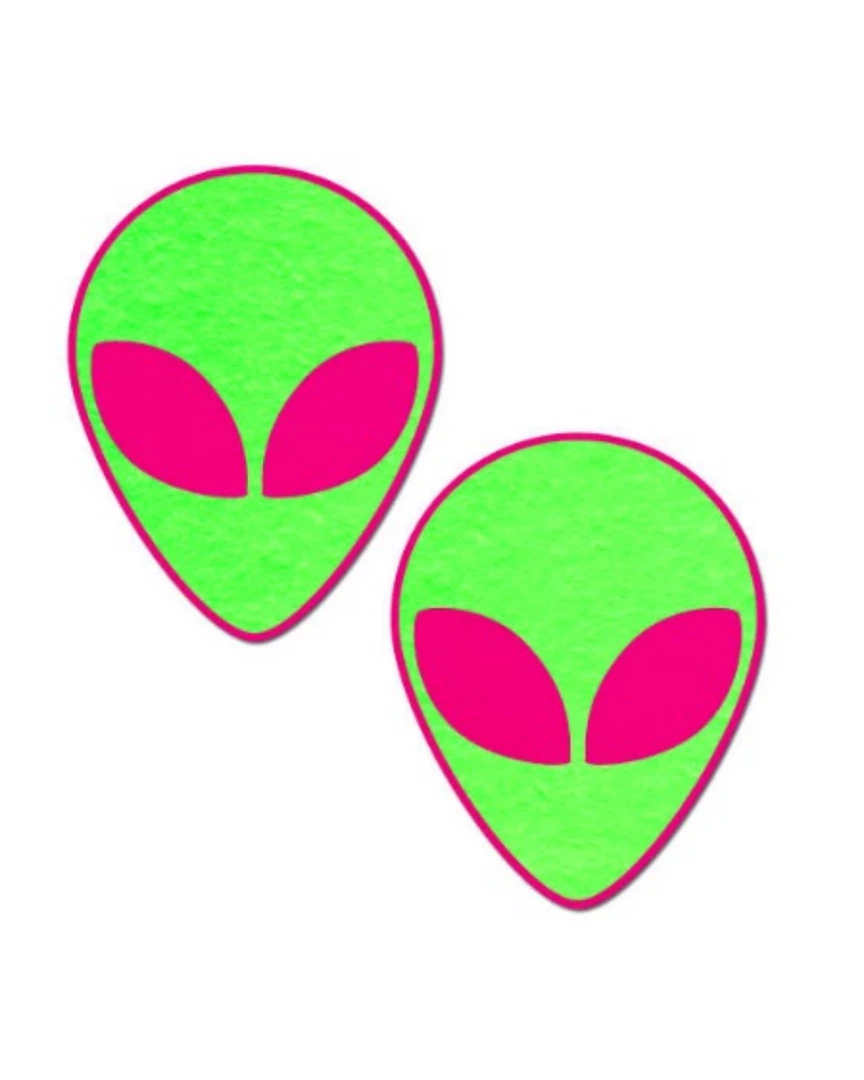 Space Alien Nipple Pasties by Pastease are hand-made in the USA of durable, no-mess glitter pleather material that forms to curves and resists wrinkling over hardening nipples.