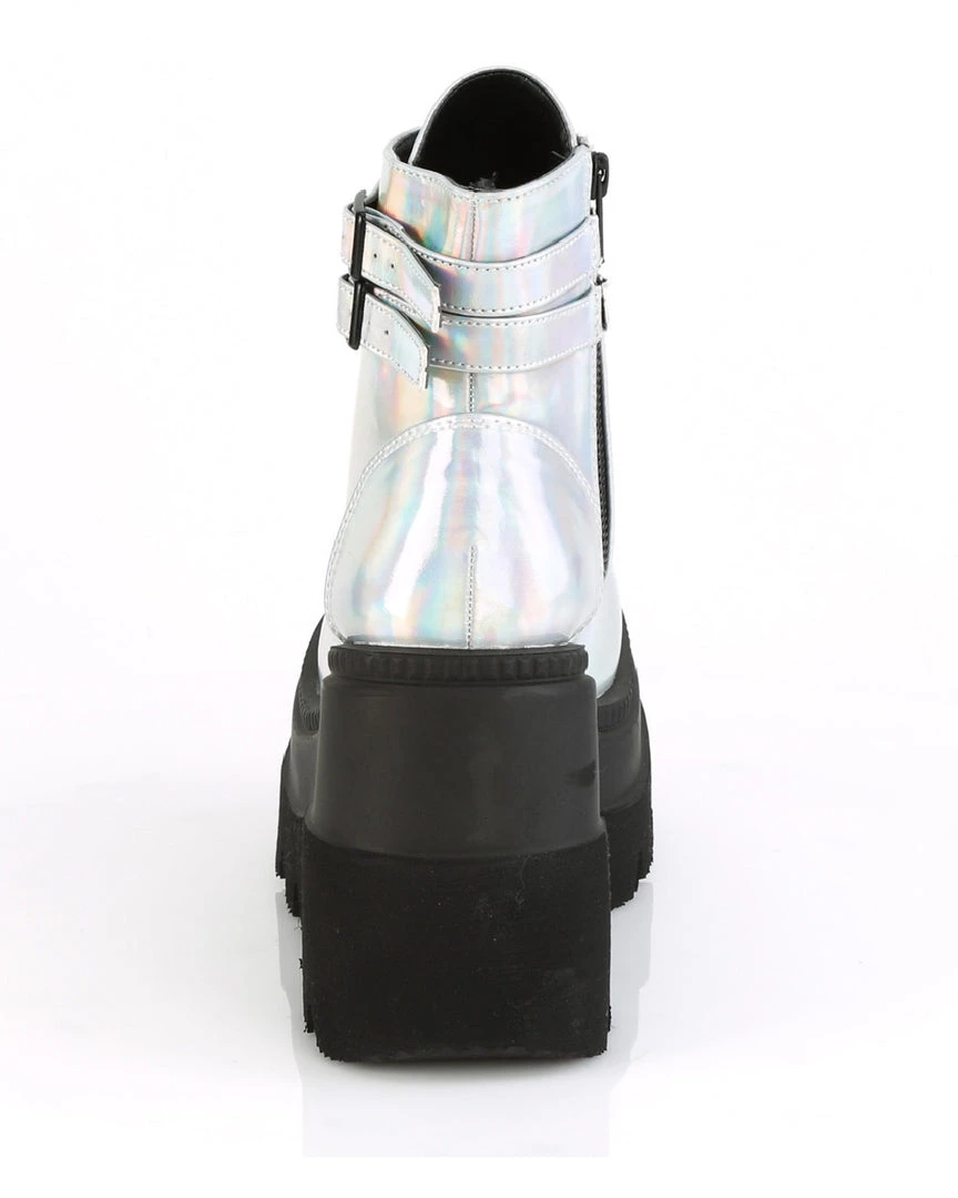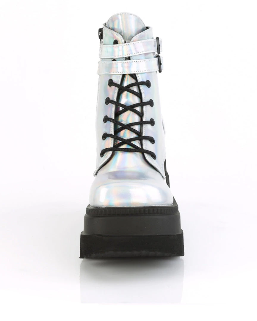 4 1/2″ (114mm) Tiered Platform Lace-Up Front Ankle Boot Featuring Double Grommet Buckle Straps, Inside Zip Closure