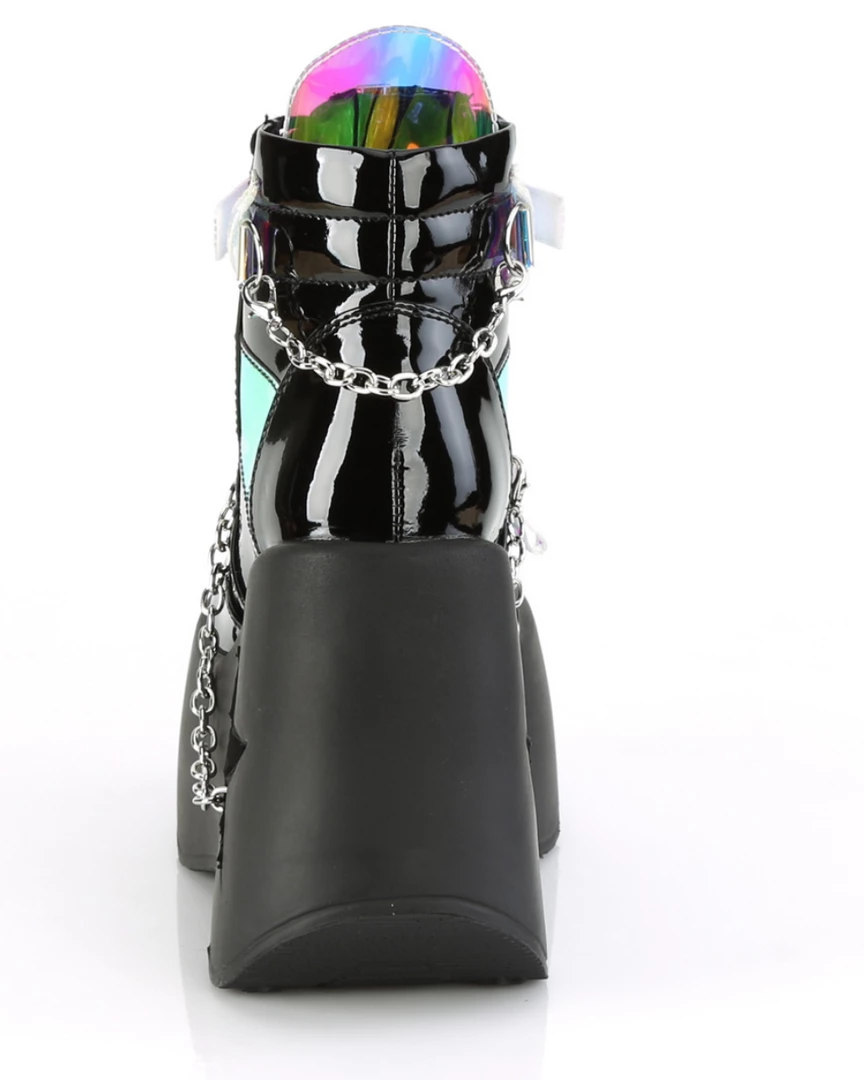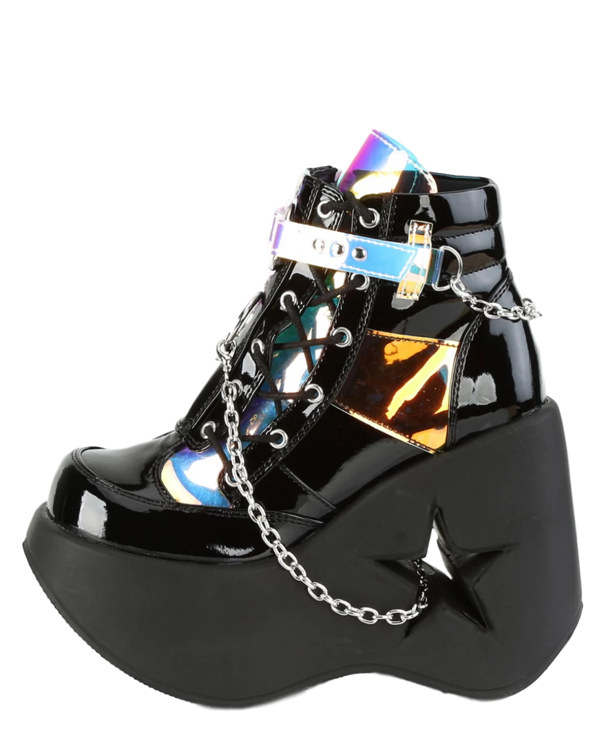 5″ (127mm) Star Cutout Platform Wedge Side Lace-Up Ankle Boot, Featuring Center O-Ring & Stud Details w/ Top Hook N’ Loop Straps & Chain Ornamentation on Heel & Through the Platform Cutout, Side Zip Closure