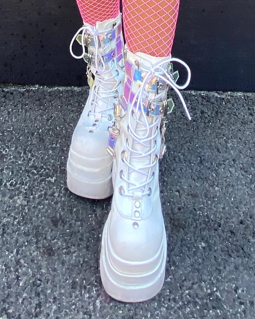 Be the first to review “Pleasers Demonia White Triple Tiered Wedge Cutout PF Lace-Up Front Mid-Calf Boot” Cancel reply
