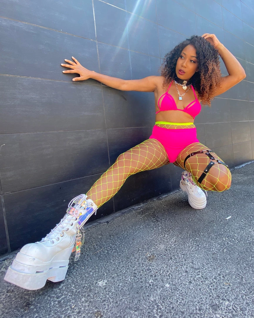 5″ (127mm) Triple Tiered Wedge Cutout PF Lace-Up Front Mid-Calf Boot Featuring Magic Mirror PVC Harness w/ Hanging Bondage Straps, Metal Inside Zip Closure