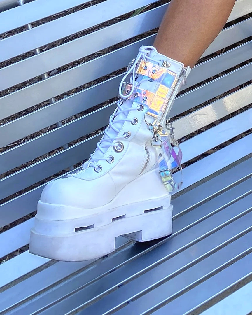 Pleasers Demonia White Triple Tiered Wedge Cutout PF Lace-Up Front Mid-Calf Boot