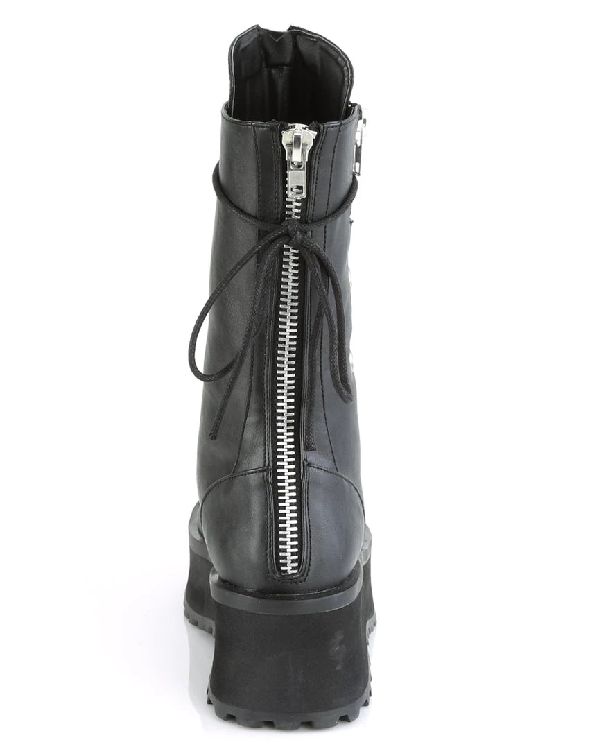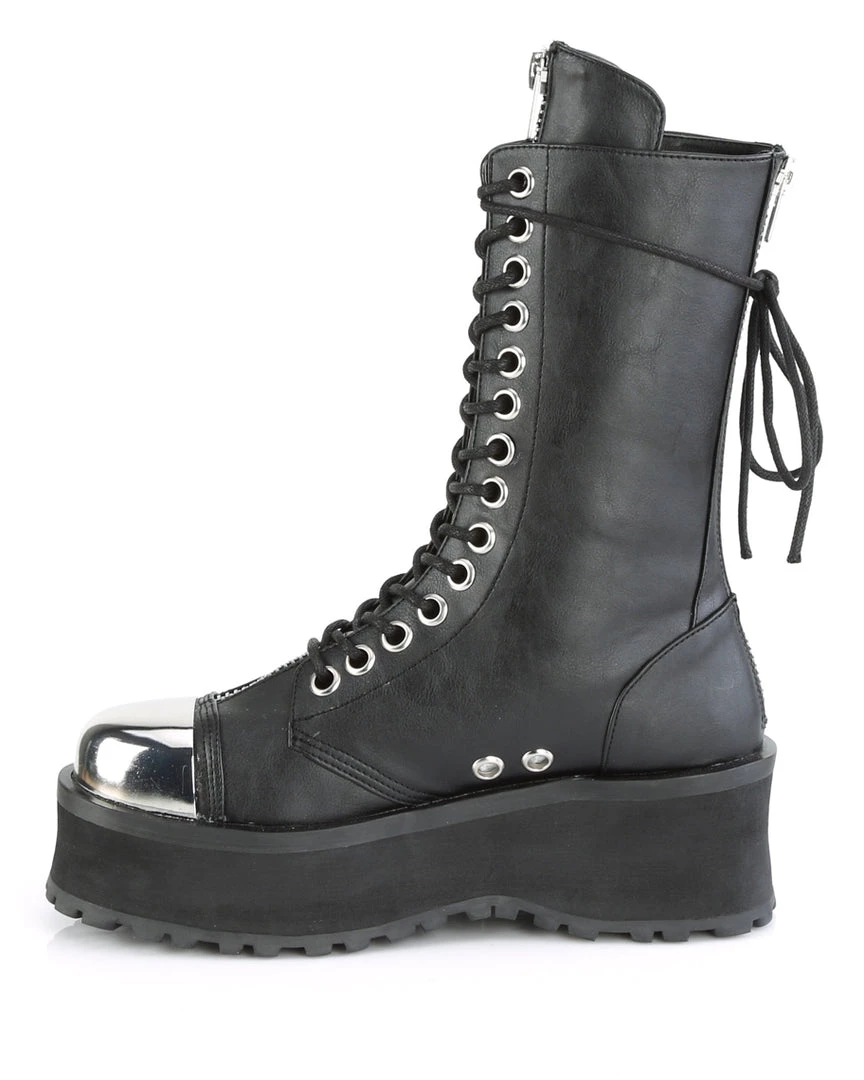 2 3/4″ (70mm) Black Vegan Leather Platform Lace-Up Mid Calf Boot W/ Silver Chrome Plated Metal Toe Cap & Ornamental Zipper Details on the Tongue & Outer Side, Metal Back Zip Closure