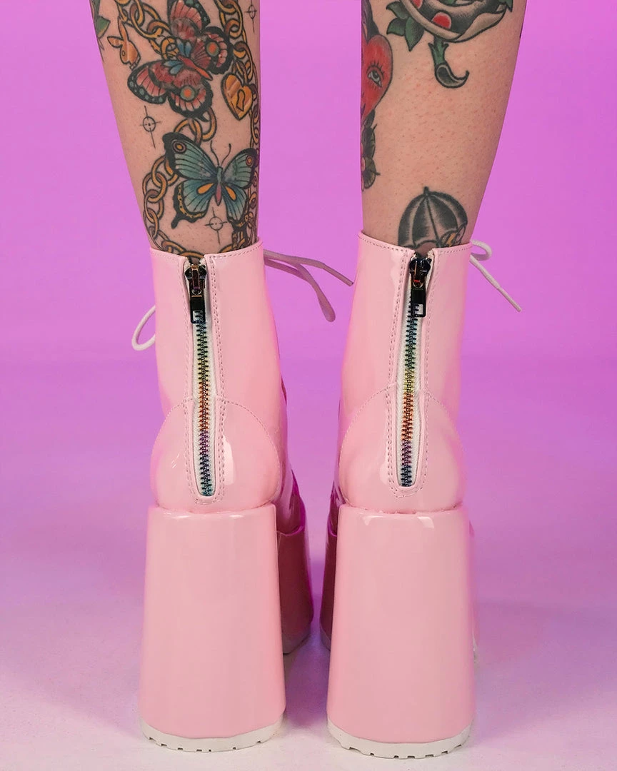 You’re guaranteed to stand above the rest in these gorgeous pink holographic lace-up ankle boots. Features full back-zip closure for easy on off wear!
