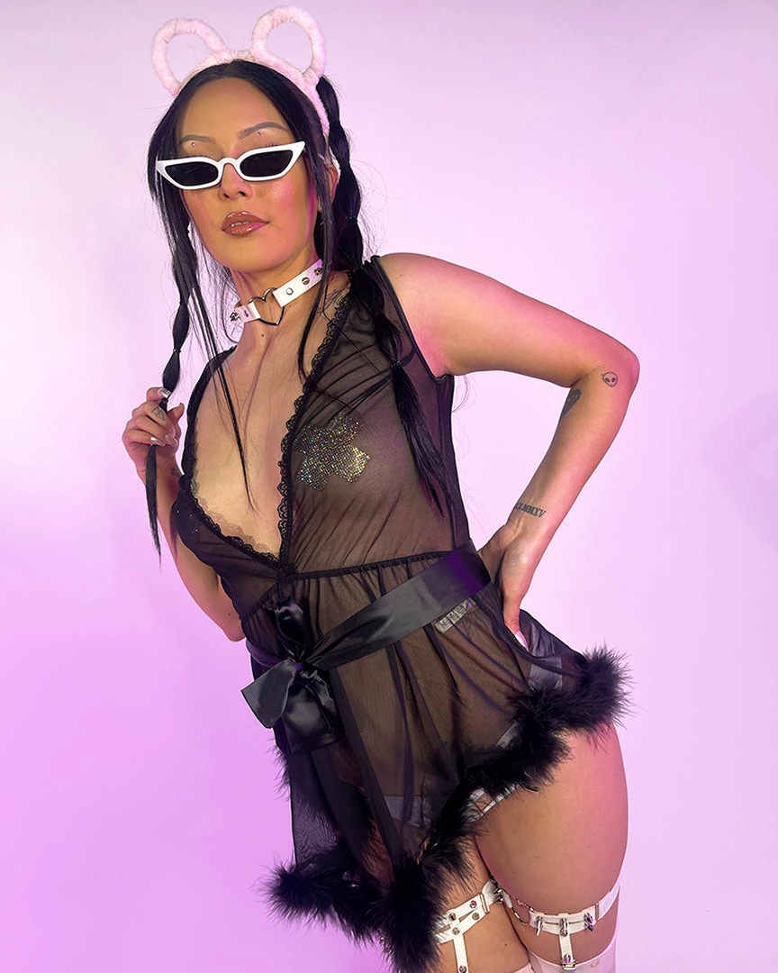 Low Cut Mesh Babydoll with Faux Fur Trim & Satin Tie
