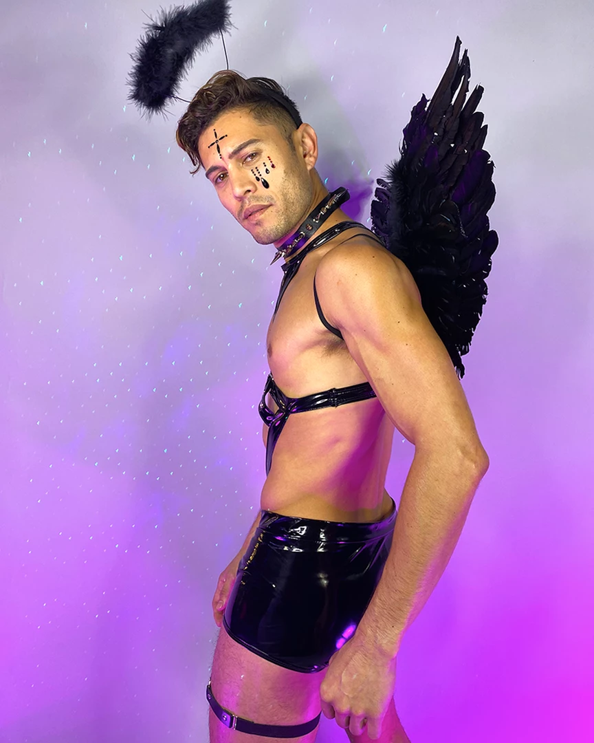 Includes Black Vinyl Singlet with Buckled Detail. Does not include angel wings.