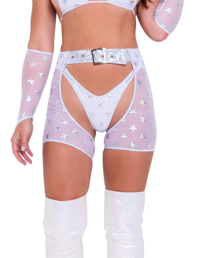 White/Silver Cosmic Stardust Mesh with Stars Print Chaps with Belt