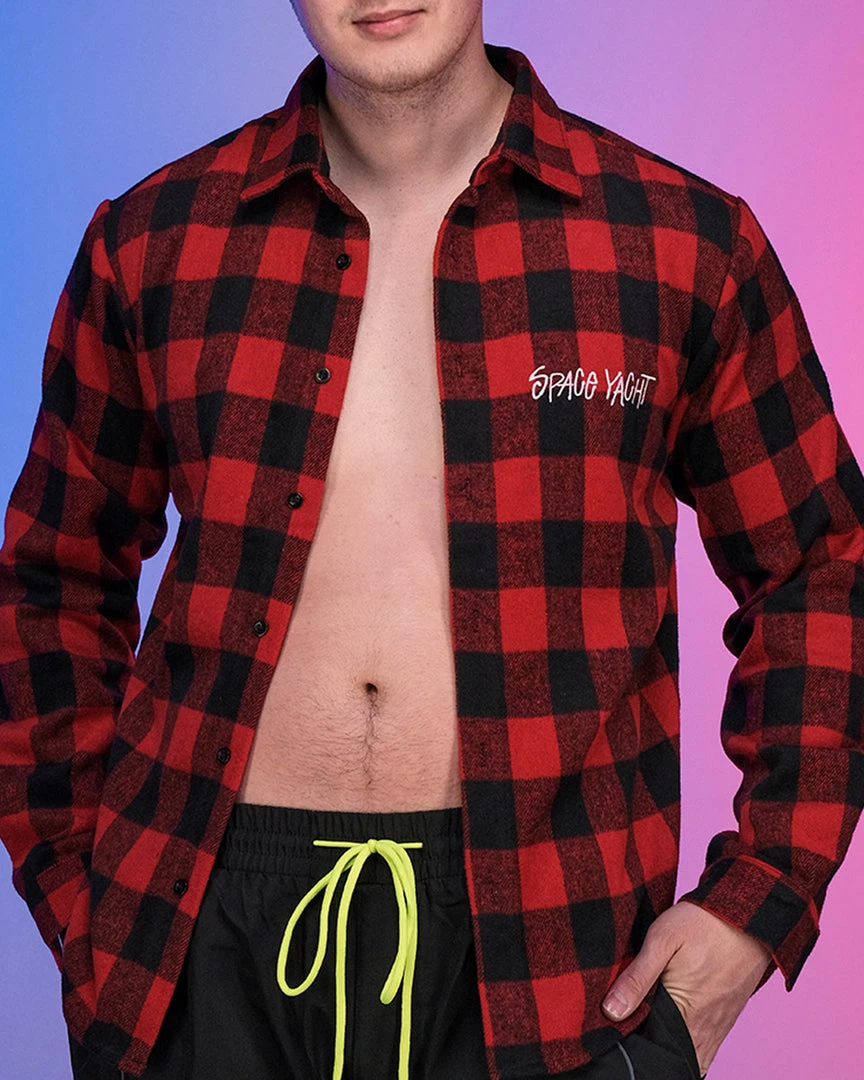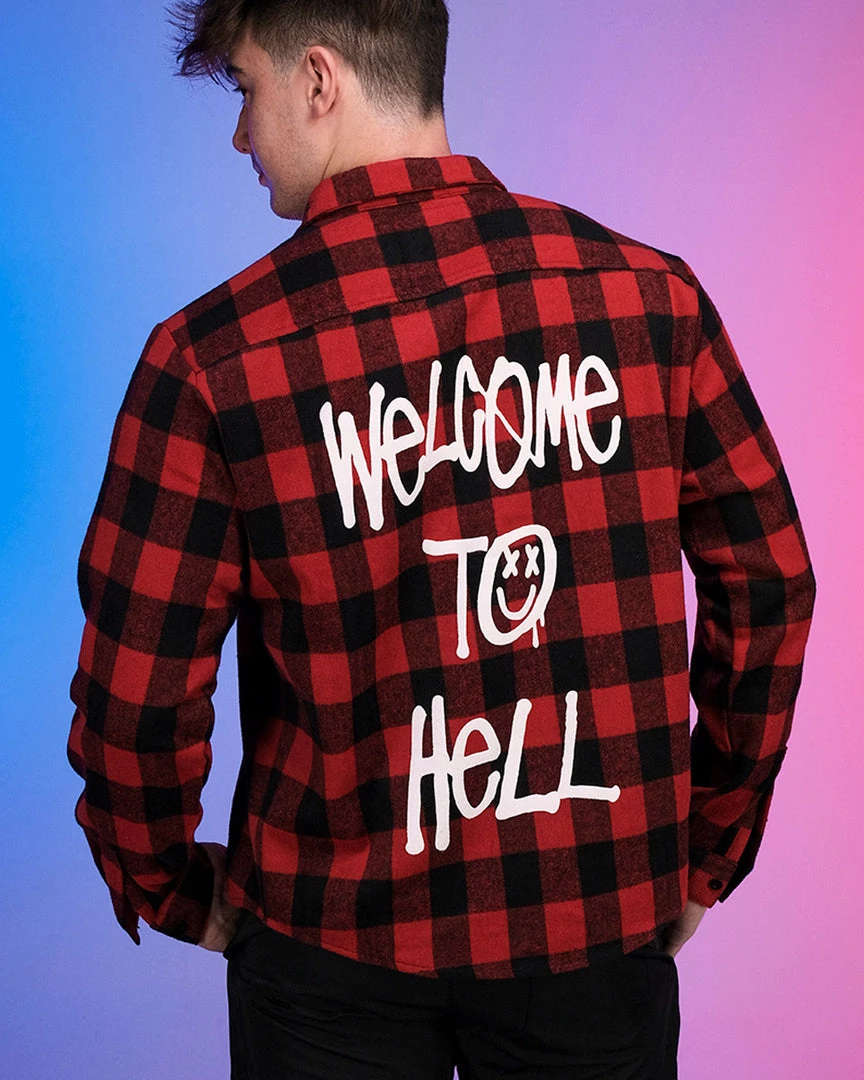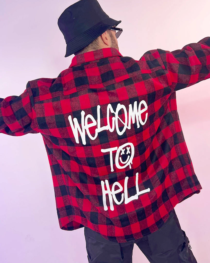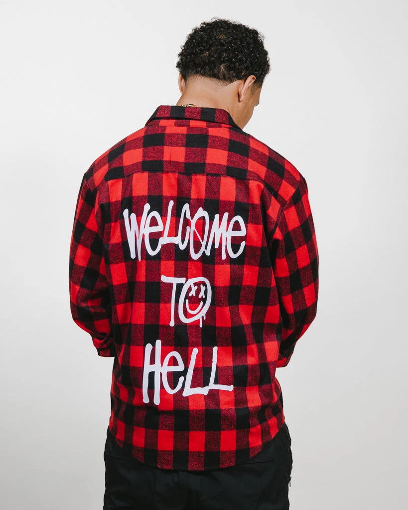 These custom-made, cut & sew flannels feature the Space Yacht script logo embroidered on the front lapel, and Space Yacht motto “Welcome To Hell” scribed across the back in puff paint. This piece offers a mixture of heavy duty construction with the soft feel that you want from a flannel.