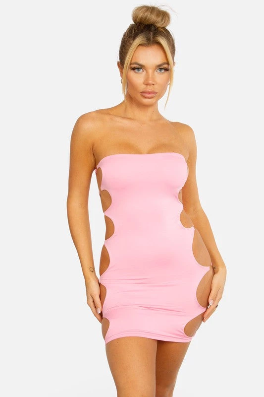This dress features cutout detail with clear straps! Comes with adjustable arm straps and super soft, stretchy fabric.