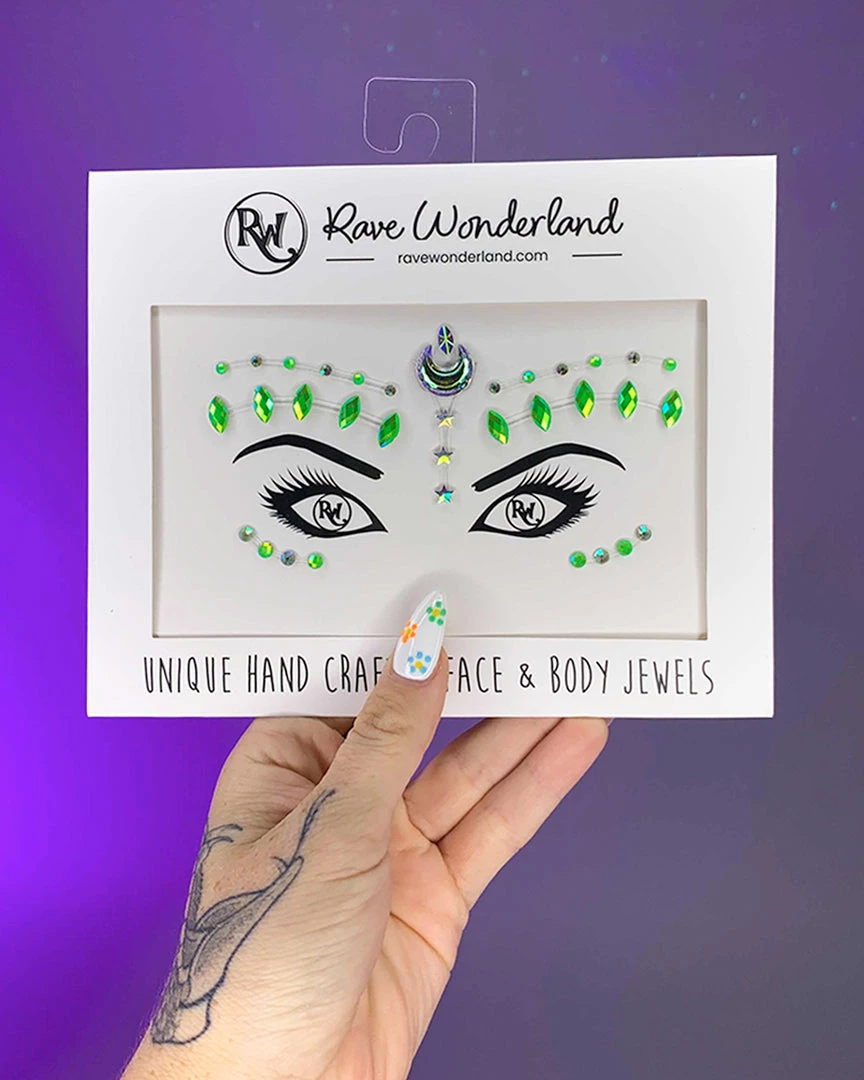 Prearranged adhesive face jewels. Just peel and stick. Long lasting adhesive for a secure discreet hold all night long.
