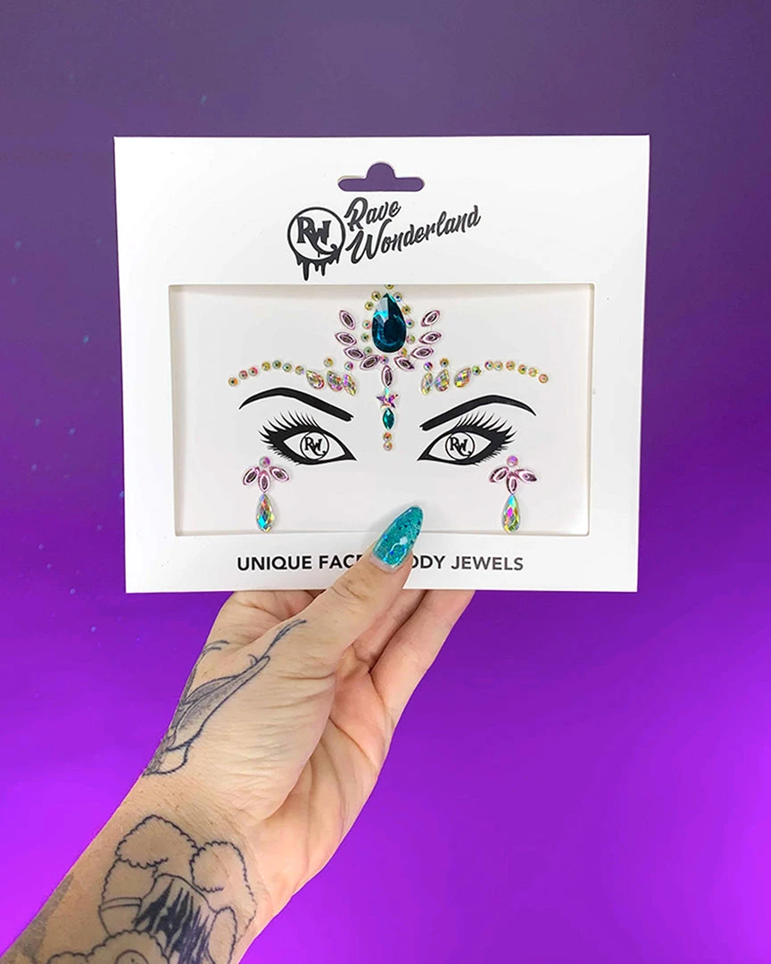 Prearranged adhesive face jewels. Just peel and stick. Long lasting adhesive for a secure discreet hold all night long. Apply to clean, dry skin for best results!